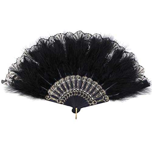 Mwoot Embroidered Flower Marabou fjäderfläkt, 1920-tal vintage stil vikbar handgjord fjäderfläkt, flikar handfan för kostym halloween dans bröllop fest prom te party - svart