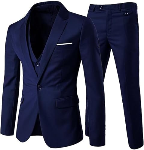 Sliktaa Män kostymer 3-delat set smal passform enkelknäppt en knapp formell smoking kostym bröllop affärer prestanda blazer väst byxor, BLÅ, S