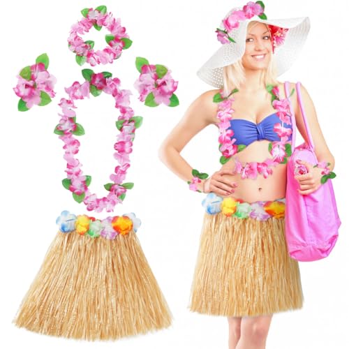 SoftcuteLee Hawaiianska girlanger rockkjol kostym tillbehörskit rockgräs kjol Lei blomma Lei Luau girlang ananas glasögon halsband kostym fin klänning för kvinnor nyhet Luau kjolar fest – 8 st