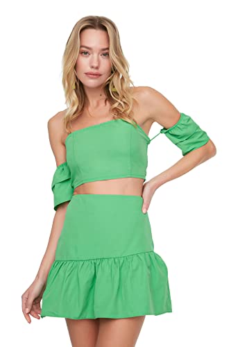 TRENDYOL Carmen Collar volym poplin botten topp kostym kjol set, Grön, 38