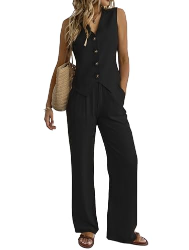 Dam linne 2 delar kläder sommar väst kostym set breda ben byxor affärer vardag semester arbetsset, Svart, S