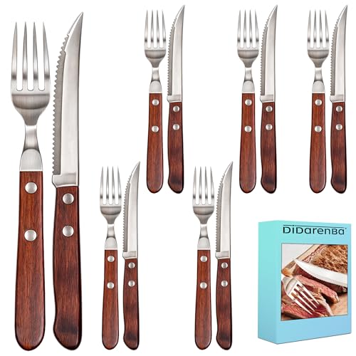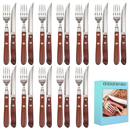 Didarenba Köttbestick i rostfritt stål trä 24 delar med köttknivar 12 delar och 12 stycken köttgafflar