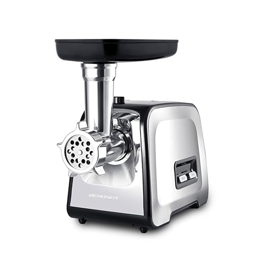 Berdsen Köttkvarn, elektriskt set med tillbehör, korvsinsats, hålskivor, strimling, 450/1200 W, silver