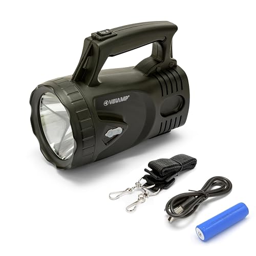 Superljusstark 5W uppladdningsbar LED-spotlight. Kraftfull professionell LED-ficklampa med 350 lumen. Räckvidd: 400 m, 5 timmars ljus. Vattentät enligt IP43. För camping, fiske, vandring och