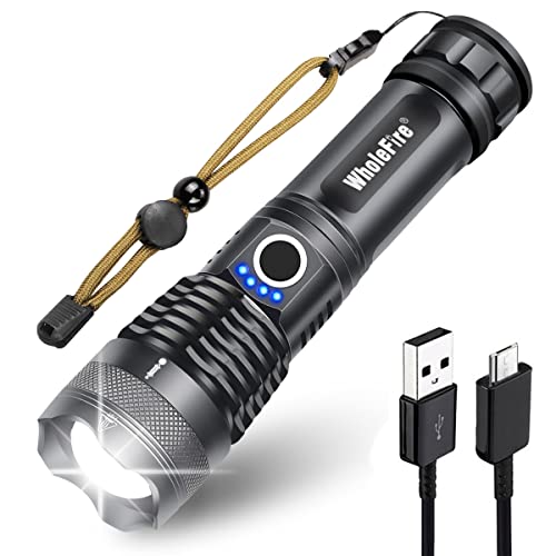 WholeFire LED-ficklampor, superljus, 90000 lumen, ficklampa, USB-uppladdningsbar, XHP90 kraftfull ficklampa, lampa med zoom, vattentät, 5 lägen för camping, vandring, cykling, utomhusaktiviteter