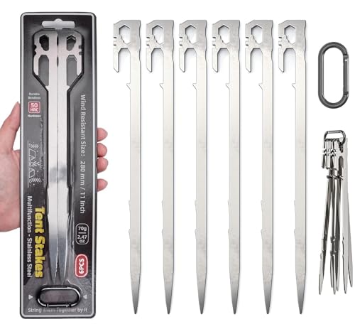 LATERN 6 st kraftiga tältpinnar, 28 cm rostfritt stål campingtältpinnar multifunktionella markpinnar med krok och hål för utomhusresa vandring trädgårdsarbete stor hård mark stenig (med karbinhake)