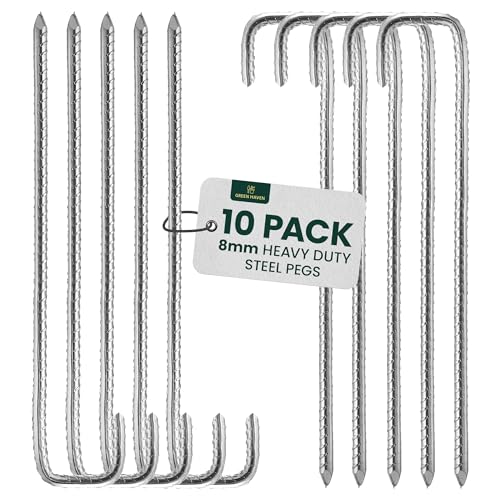 Green HAVEN Ultra-starka kraftiga tältpinnar Paket med 10 – extra tjocka tältpinnar metall campingpinnar | rostbeständig J-pin 8 mm tjock tältpinne | Perfekt för jordbruksstaket, camping, trädgård