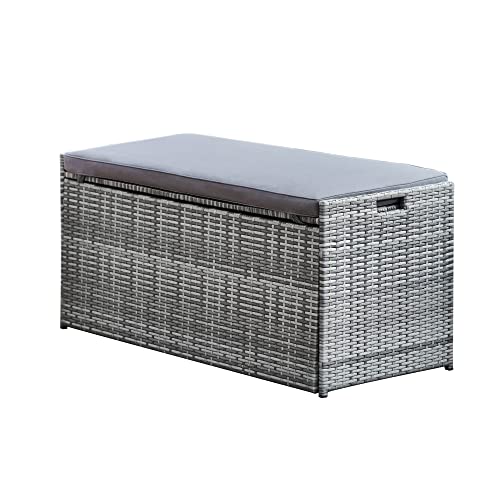 Teamson Home Utomhus trädgårdsmöbler, 2-i-1 rotting 336 liter stor förvaringslåda och bänksits med krämkudde, väderbeständig, grå