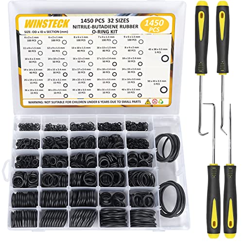 WINSTECK 1450 st. tätningsringar, set, O-ring, krok, verktyg, 32 storlekar, tätningsringar, platt tätning, tätningssats, sortiment med 4 st. plock krokverktyg för slang kran, bil, tätningsreparation