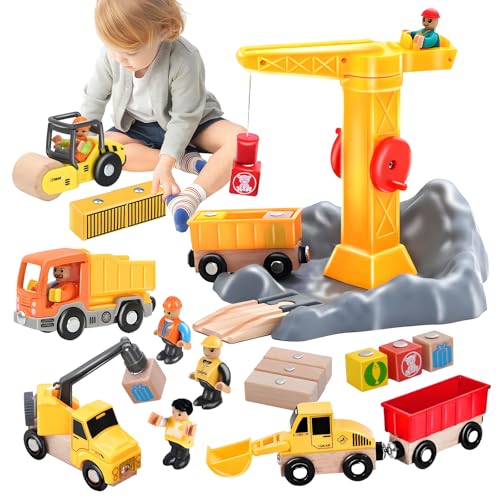 RoserRose byggarbetsplatsfordon barnkran leksaker, byggfordon barn träleksaker, med tornkran grävmaskin kranbil dump truck vägrulle, gåva för från 3 4 5 6 år pojke