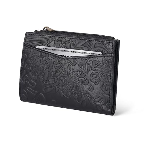 Ekläder läderplånbok för kvinnor – liten RFID-portmonnä kreditkort och ID-hållare för damer, present till kvinnor, dubbelvikta plånböcker, Crazy Horse svart blomma, Small, ID-fodral