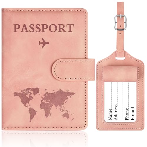 OFFCUP Passfodral för hållare, PU-läder passfodral och bagagelapp set med RFID-blockerande reseplånbok, bärbar universell reseplånbok fodral organiserare för pengar, boardingkort, kreditkort, Rosa