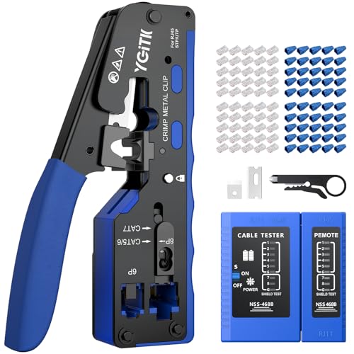 YGiTK RJ45 Krimpverktyg med Nätverkstestare, Nätverksverktygssats Krimpverktyg för 8P RJ45 CAT5, CAT5e, CAT6, CAT6a, CAT7, CAT7a med 50PCS Genomgående Anslutningar och Skyddskåpor