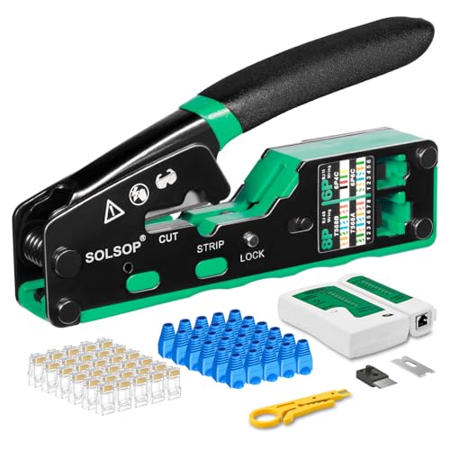 Solsop RJ45 pressverktyg som passerar genom – Cat6 krympverktyg för Cat5 Cat5e Cat6 8P8C kontakt, allt-i-ett RJ45 krimpverktyg och LAN-testare