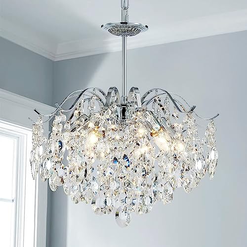 WUZUPS Kristallkrona med 5 ljus, modern taklampa för sovrum, hall, bar, kök, badrum, 57,4 x 48,7 cm (H x B), bas E12, krom