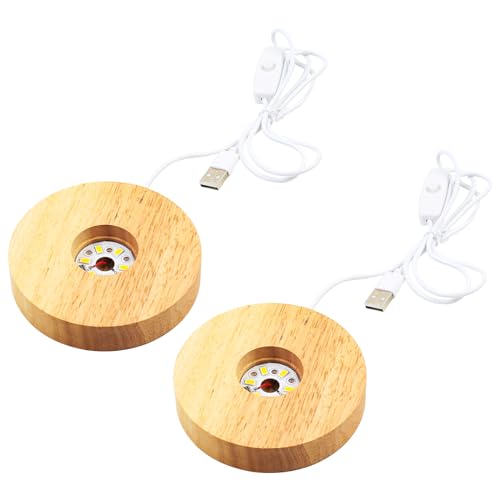 MaxEarn 2 stycken rund LED-ljusbas, 10 cm USB LED-lampor, display bas, trälampstativ, varmt ljus träbelysning, för gör-det-själv akrylplatta glas kristallkula