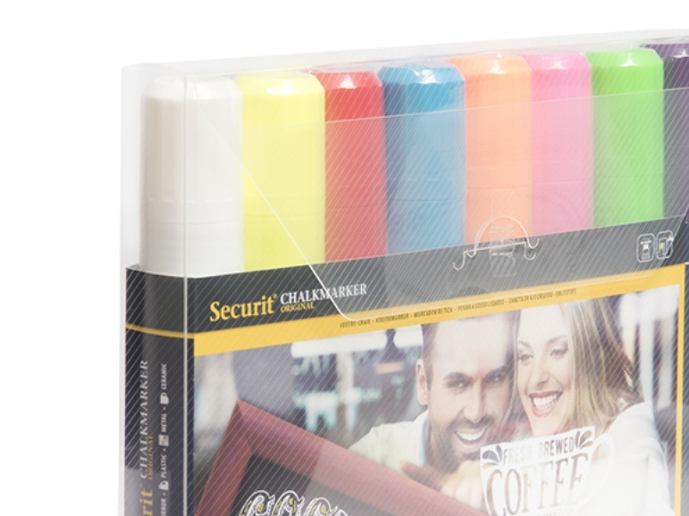 Securit Original krita markör penna blisterpaket, 1-2 mm spets förpackning med 4, vita, flytande kritpennor, whiteboardmarkörer, kritpennor för svart tavla, vita raderbara pennor