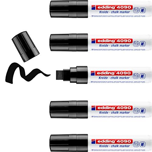 edding 4090 kritmarkör – svart – 5 kritpennor – kilspets 4–15 mm – bred kritpenna för avtorkbar tavla – för märkning av fönster, glas, spegel – bordspenna med ogenomskinliga färger