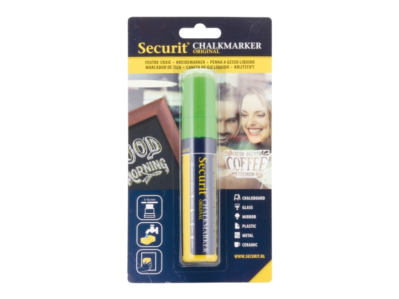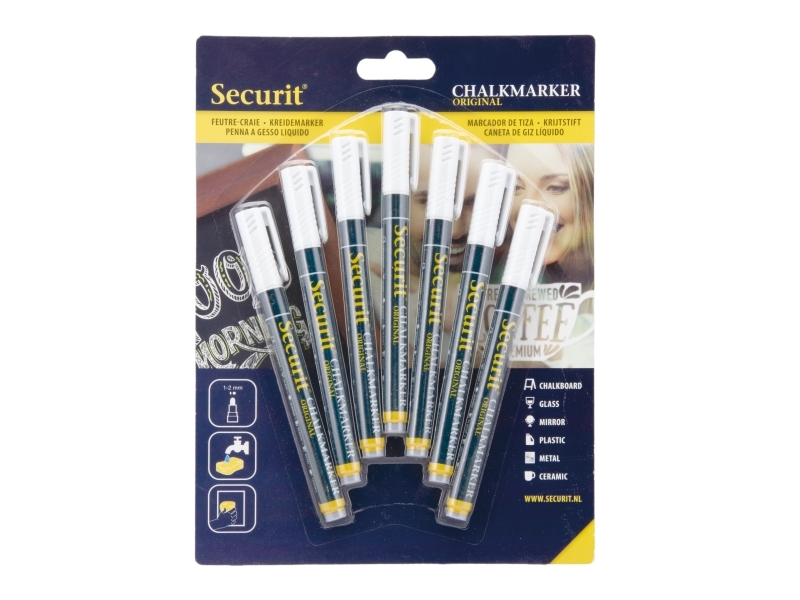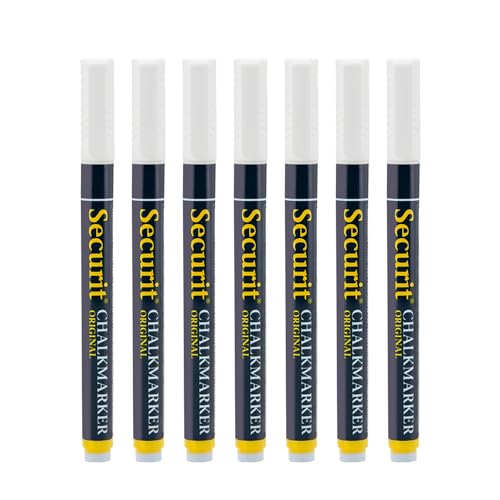 Securit Original kritmarkörpenna blisterförpackning, 1–2 mm spets förpackning med 7 – vita, flytande kritpennor, whiteboardmarkörer, kritpennor för skrivtavla, vita suddbara pennor