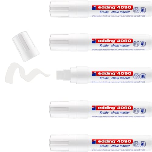 edding 4090 kritmarkör – vit – 5 kritpennor – kilspets 4–15 mm – bred kritpenna för att torka av tavlan – för märkning av fönster, glas, spegel – bordspenna med ogenomskinliga färger