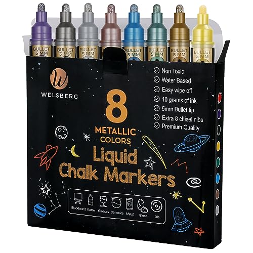 Welsberg 8 x flytande kritpennor metalliska färger, raderbara flytande kritmarkörer 5 mm spets för tavla, fönster, glas kritpennor med jumbo bläck 10 gram