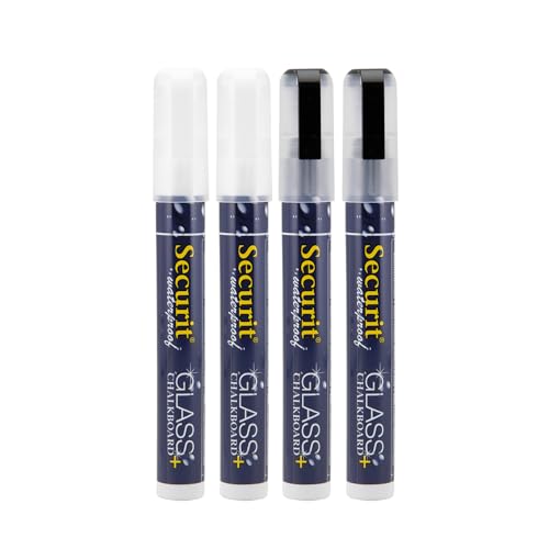 Securit Vattentätt set med markörpennor i glas och svart tavla, medium spets, 4-pack – 2 x svarta flytande kritpennor, vattentäta markörpennor, 2 x vita fönstermarkörer för skyltar och visningsbrädor