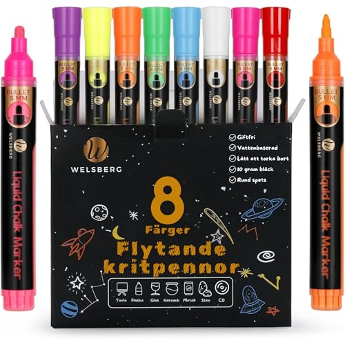 Welsberg flytande kritmarkörer, 8 kritpennor med 5 mm vändbar spets för svarta tavlor, fönster, glas, whiteboard, raderbart jumbobläck - för skolan, kontoret, hemmet