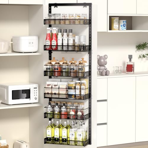 TOPWE Kryddställ över dörr, 6 nivåer, justerbar över dörr, köksförvaring, skafferi, dörrorganiseringshyllor med krok för varje lager, bakdörr, metall, hängande kryddställ för kök, skafferi, badrum