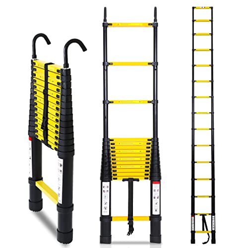 Ikodm Teleskopstege i aluminium med avtagbar krok, 3,2 m utdragbar stege, halkfri aluminiumstege stående stege multifunktionsstege, utdragbar stege, belastning 150 kg, svart gul