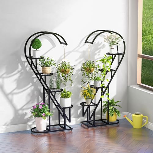 COSTWAY 5-stegs metall växtstativ hjärtformad, blomhylla med krok, stege växthylla tippskydd, växtstege blomställ, för trädgård balkong vardagsrum (svart)