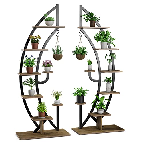 COSTWAY 6-stegs metallväxtstativ i halvmåneform, blomhylla med 2 små hyllor och övre krok, stege växthylla tippskydd, blomkruksstativ för trädgård, balkong vardagsrum (2 st.)