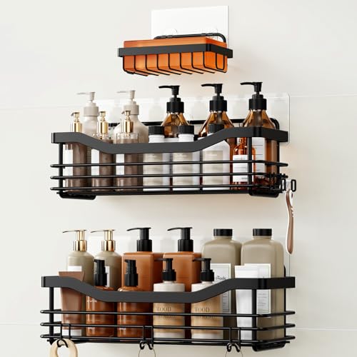 Orimade Duschkorg, tvålskål, hållare, hylla med 5 krokar för badrum, organisering, hylla, kök förvaringsställ, väggmonterad och självhäftande utan borrning i SUS304 rostfritt stål – 3-pack (svart)