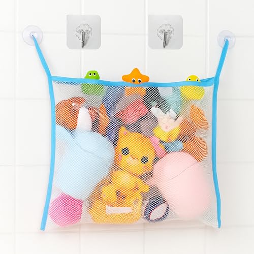 Wemk Förvaringsnät för badrum, leksaker, förvaringsväska för leksaker, med 4 krokar, robust, självhäftande (bonus: duschsvamp)