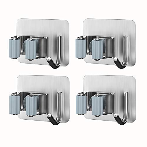 YUEHAO Väggmonterad borsthållare, rostfritt stål, självhäftande mopphållare med krokar, multifunktionell kvastskåp för kök, trädgård, badrum, garage, balkong, kontor, grå, (YH004)