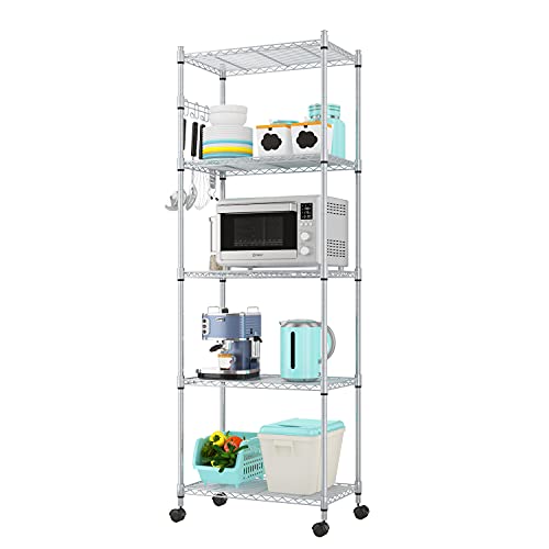 Devo 5-våningshylla med hjul, höjdjusterbar stående hylla med hjul skafferi på rullar förvaringsslang med krokar för badrum, kök, silver, 36 cm x 61 cm x 180 cm