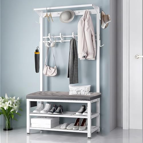 LHHL Stort Klädhängare Fristående Hallträd Garderobställ Med Krokar Sittbänk Metallram Garderob För Kläder Handväska Sko Metallram För Hall Ingång Kontor (Color : White graey, Size : 100x33x170cm)