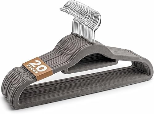 Sasha Morel 20-pack klädhängare i sammet – halkfria sammetshängare för kläder, platsbesparande vuxenhängare med slipsorganisering och vridbara krokar – klädhängare garderobsförvaring – grå