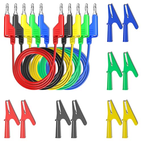 Cleqee 4 mm stapelbar banan till banankontakter mätkablar med 10 stycken helt isolerade koppar krokodilklämmor för multimeter elektrisk testning 5 färger
