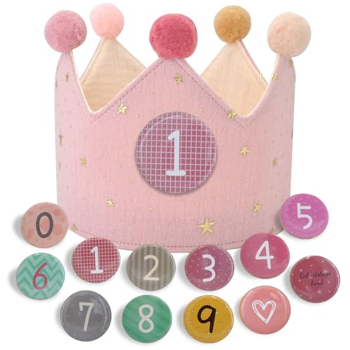 JOYUE Födelsedagskrona för Barn, Födelsedagskrona av Muslin med Utbytbara Siffror från 0–9, Justerbart Tygkrona Pannband Unisex Krona för Barn Födelsedagsfest (Rosa)