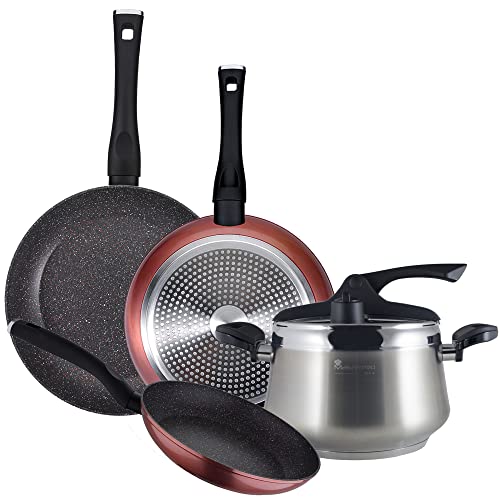 Förpackning med 3 stekpannor Ø 20/24 och 28 cm och 6 l kruka i rostfritt stål