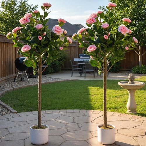 GarveeHome Set med 2 konstgjorda kamelträd (75/85/90/110/120 cm), konstgjord kameliväxt med 16/20/24 blommor, konstgjord växt i kruka för hem, ytterdörr, inomhus och utomhus