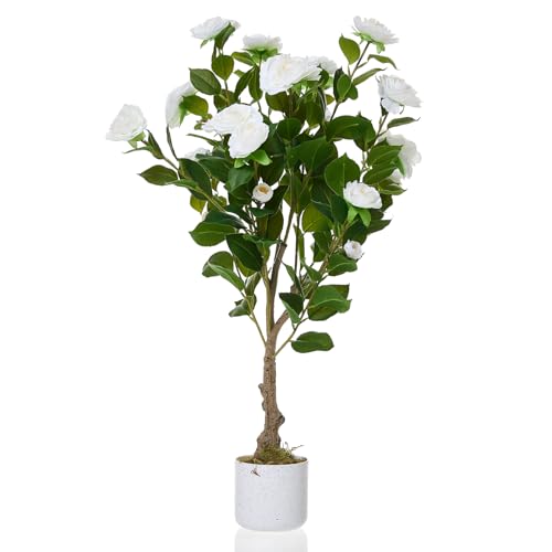 GarveeHome Konstgjord kameliaträd (75/85/90/110/120 cm), konstgjord kameliväxt med 16/20/24 blommor, konstgjord växt i kruka för hem, ytterdörr, inomhus och utomhus