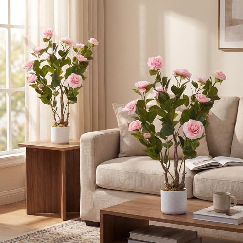 COSTWAY Set med 2 konstgjorda träd med blommor 95 cm, konstgjord kameliaträd, konstgjord växt i kruka, kameliväxt med 24 blommor och naturlig stam, konstgjord blomma hemma, inomhusväxt fällväxt (2