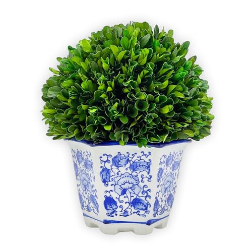 Galt International bevarad naturlig buxbom i keramisk kruka – växt och bord mittpunkt – fantastisk grönska och växtdekor för hemmet – blå och vit – 24 cm lång