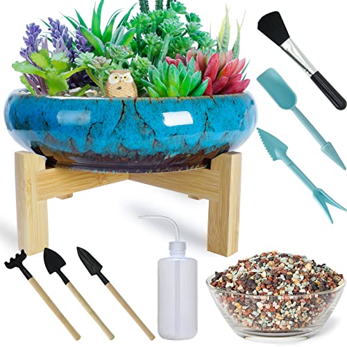 Suckulenta växtkrukor med dränering, 25 cm stora suckulenta planterare med stativ – keramisk bonsaikruka för inomhusväxter kaktus blomma växt kruka plus suckulent planteringsverktygsset och 2,9 kg blandade stenar