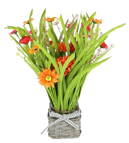 Konstgjord gräsbuske med tjusiga vallmo i kruka, 40 cm, gräslinning, Gerbera, konstgräs, bussla, gräsarrangemang, dekoration, konstväxt, gräslåt, grön växt, växt, prydnadsgräs, buskar, orange
