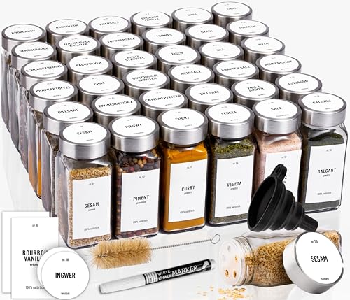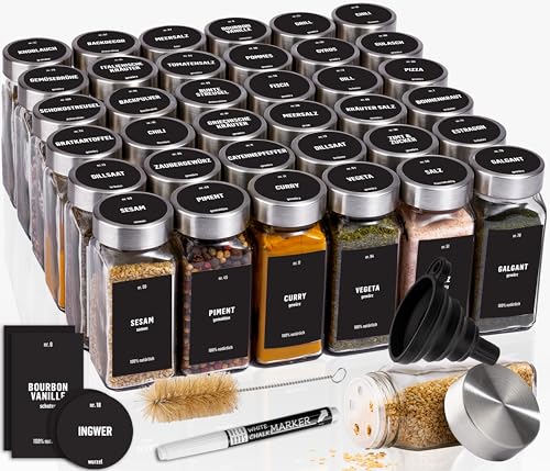 Deco Haus® Kryddburkar Fyrkantiga Lufttäta 36-set [inkl. Etiketter & Ströinsats] - Kryddkärl Set i Glas - Kryddbehållare Spice Jars - Kryddförvaring - Behållare för Kryddor - Kryddförvaring
