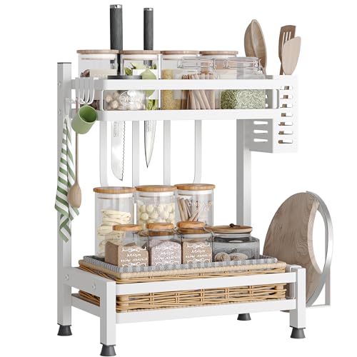 NETEL 2 nivåer rostbeständig kryddhylla för köksförvaring, kryddhållare, köksorganisatör för bänkskiva med redskapshållare, skärbrädstativ, vit