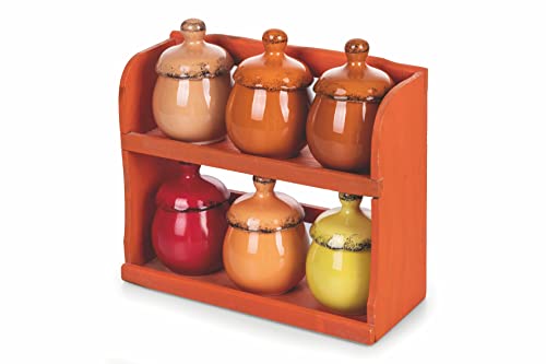 Villa d'Este Home Tivoli Set med 6 burkar Keramisk kryddhållare med trästativ, Baita Sunset, Brun, Small