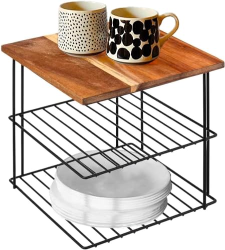 HEFTMAN Köksskåpsarrangör – uppsättning av 2 trä- och metallhyllor för skåp, platsbesparande, stapelbar, skåphylla, organiserare för bänkskiva, skafferi – kryddhylla rymmer 15 kg (naturligt och svart)